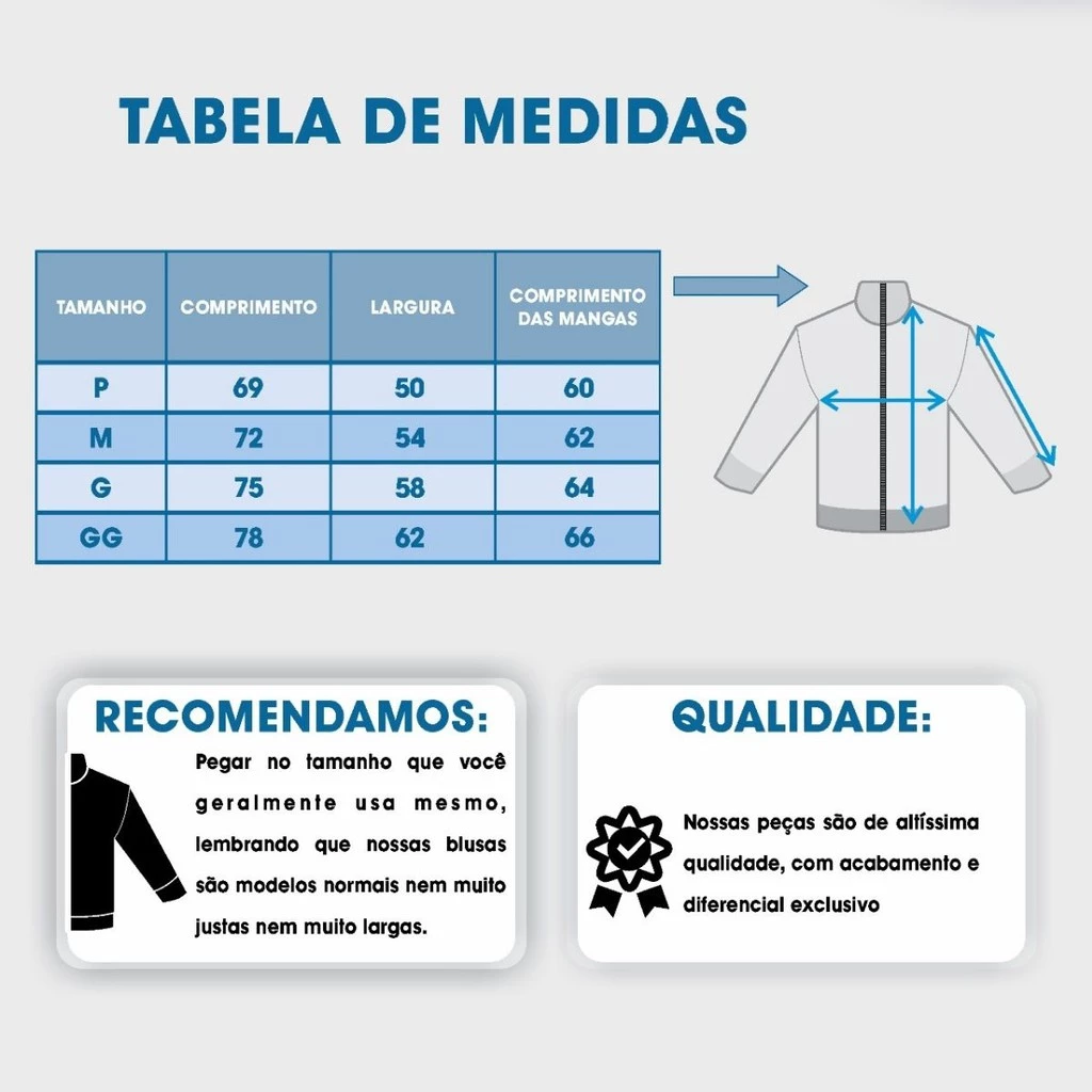 GG: corpo : 80 cm comprimento x 64 cm largura / manga : 66 cm comprimento x 20 cm largura