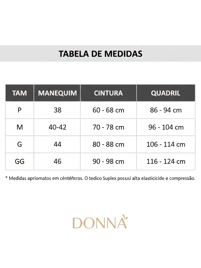 Material Premium: 92% poliéster e 8% elastano, oferecendo tecido encorpado, com ótima elasticidade e compressão para modelar e sustentar o corpo.