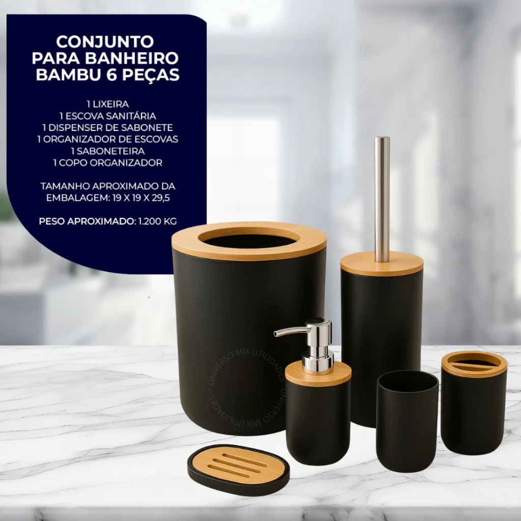 Este kit de banheiro de 6 peças é a combinação perfeita de estilo e funcionalidade. Com design moderno e elegante, ele adiciona um toque de sofisticação ao seu banheiro, tornando suas rotinas de higiene mais agradáveis.