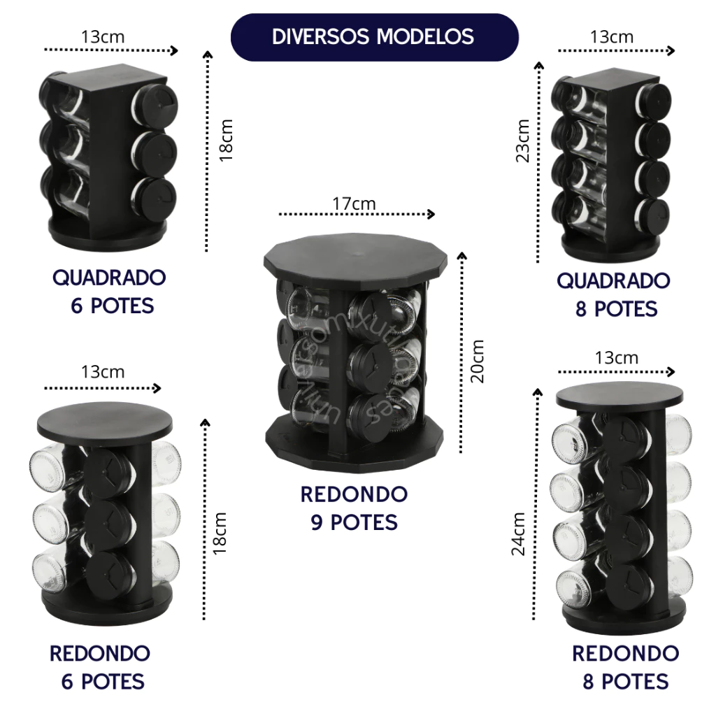 Porta Tempero Giratorio Preto Com 6/8/9 Potes Vidro Reforçado Premium